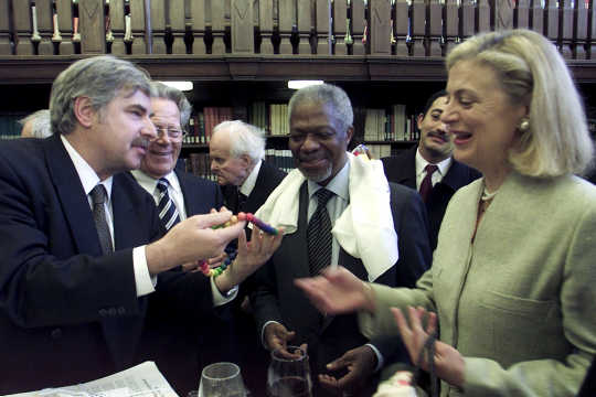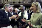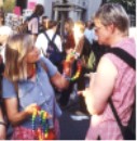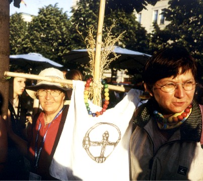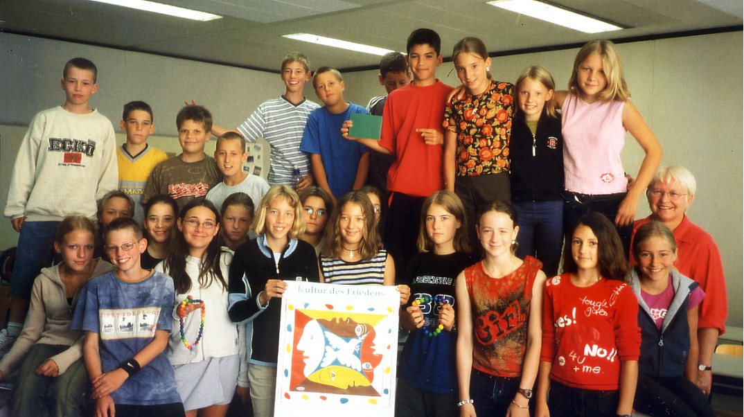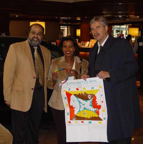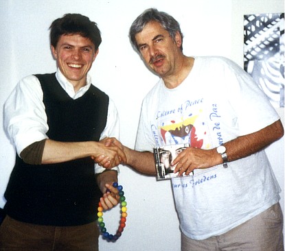 Society Culture of Peace Friedensketten ![]() "KETTEN-REAKTION FRIEDENSKETTE" Der Regenbogen als Symbol des Friedens und der Hoffnung! Die "Kettenreaktion Friedenskette" unterstützt die Arbeit der Gesellschaft Kultur des Friedens Weitere Informationen: Flugblatt (PDF) Wenn Sie die "Kettenreaktion Friedenskette" unterstützen wollen, kontaktieren Sie uns. Die "Kettenreaktion Friedenskette" ist eine Idee von Inge Kleinert. ![]() Inge Kleinert erklärt die Idee der Friedenskette einer Passantin auf dem Kirchentag Unterstützer/innen der Idee "Kettenreaktion Friedenskette" ![]() Konstantin Wecker unterstützt die "Kettenreaktion Friedenskette" Angela Davis unterstützt die Aktion Friedenskette für das Kulturzentrum Jenin 1 2 3 4![]() 1 Paddy Kelly bei der "Übergabe" der Friedenskette mit Henning Zierock (GKF) in Berlin 2 Paddy Kelly unterstützt die Aktion Friedenskette als Teil seiner Friedensaktivitäten 3 Pilgerinnen mit der Friedenskette, die gerade von einem 500 km-langen Pilgerweg Magdeburg-Gnesen (Polen) auf dem Berliner Kirchentag eingetroffen sind. Sie setzen sich damit für eine Verständigung zwischen Ost- und Westeuropa ein. 4 Konstantin Wecker trägt auf seiner Konzert-Tour die Friedenskette 5 6 7![]() 5 Annik und Konstantin Wecker auf der Solarkonferenz am Bodensee 6 Almaz Böhm (Äthiopien) und Viny Sansi (Indien) mit der Friedenskette, rechts Henning Zierock 7 Uri Avnery, israelischer Friedensaktivist, auf unserer Veranstaltung in Tübingen, unterstützt die Kettenreaktion Frieden. www.gush-shalom.org ![]() Henning Zierock (links) überreicht Kofi und Nane Annan die Friedenskette ![]() Bild links: Die Klasse 6e des Wildermuth-Gymnasiums Tübingen hat aus ihrer Klassenkasse für eine Schule in Bagdad gespendet. Einige Schüler/innen haben auch Briefe an irakische Schüler/innen geschrieben, die die GKF mit in den Irak nehmen wird. Rechts die Klassenlehrerin Dorothea Ziegler. Bild rechts: Übergabe der Spenden an Henning Zierock (GKF, links) ![]() Nina Hagen und Paddy Kelly beim Konzert für Irak, Freiburg 2004 >>> weiter |