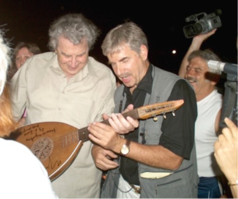 Kontakt: Theodorakis-Chor Tel. 07071-52200 und 0711-7194405 >>> Flugblatt (PDF) ![]() Mikis Theodorakis (links) und Henning Zierock, Leiter des Theodorakis-Chores, sangen mit einer irakischen Laute für die Musikschule Bagdad, am 29. Juli 2004 in Korinth |